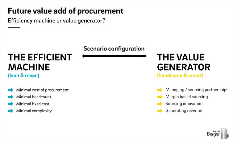 To consider how your company might embrace some of the scenarios, one main point must be clarified in advance: Should your company’s procurement function be positioned as an efficiency machine or a value generator?