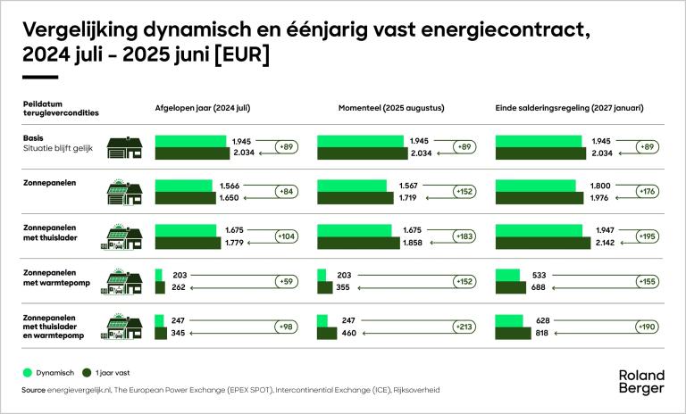 In opdracht van Zonneplan voerde Roland Berger een onderzoek uit naar de kosten van verschillende energiecontracten. Doel: inzicht geven in welke contractvorm in het verleden het voordeligst was, en welke keuze in de toekomst het meeste voordeel biedt In de periode juli 2024 tot en met juni 2025 waren dynamische contracten voor álle onderzochte huishoudprofielen voordeliger dan vaste of variabele contracten – met prijsverschillen die opliepen tot 40%.