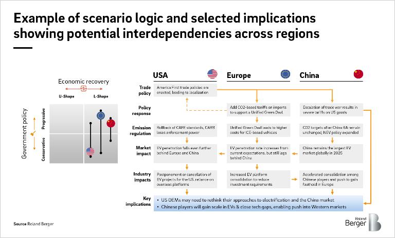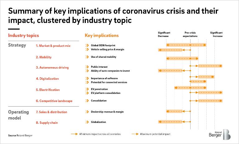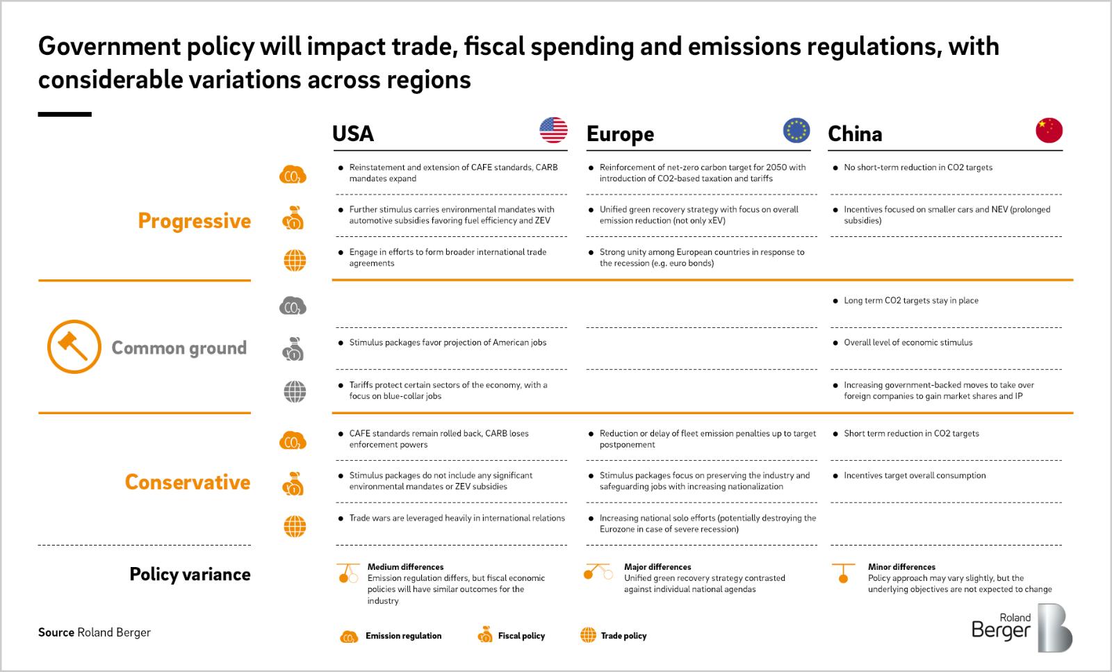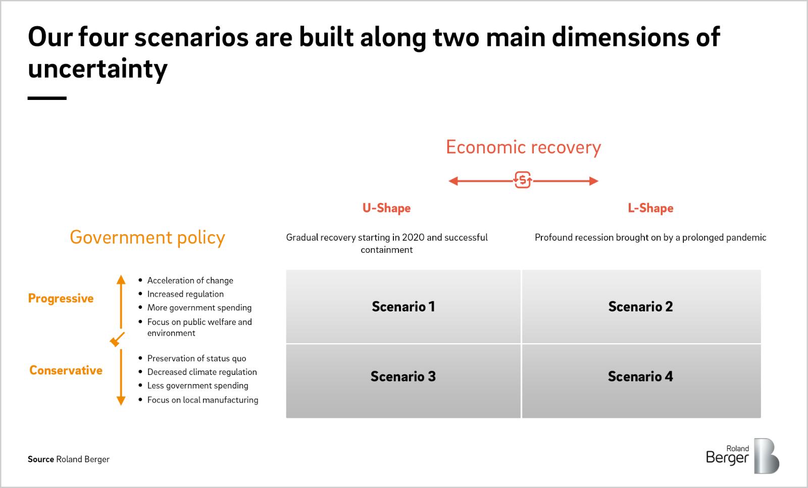 To determine these, Roland Berger analyzed dozens of potential scenarios based on plausible government responses and types of economic recovery. Working through these scenarios produced a set of key implications for the industry in the studied regions (US, Europe and China), including several eye-catching takeaways: