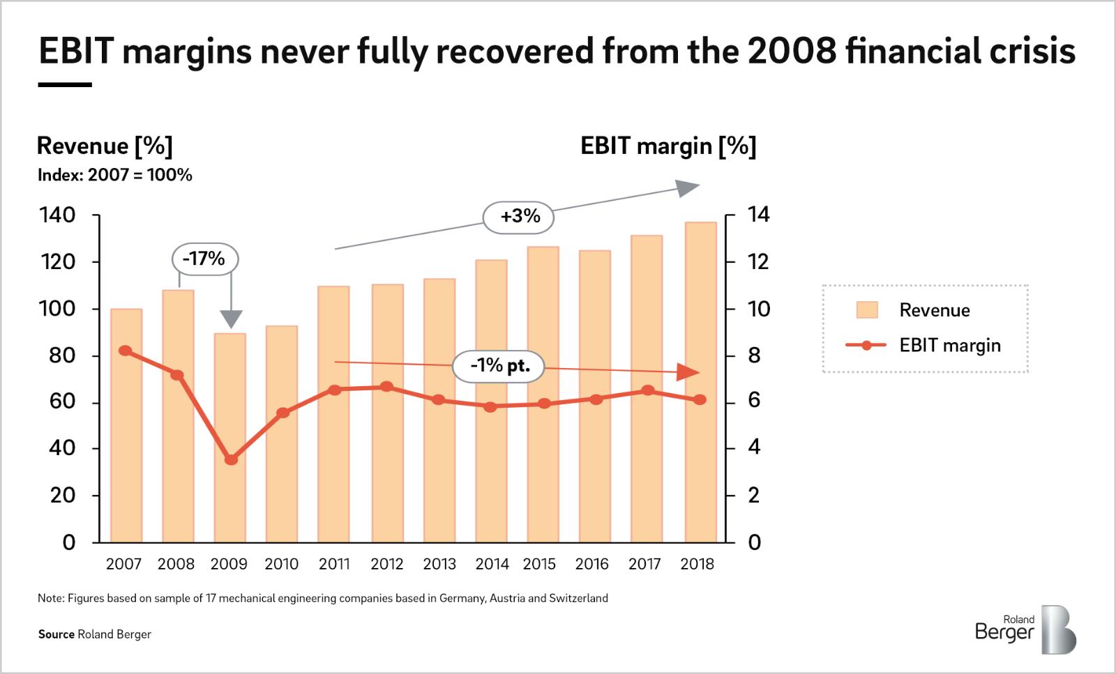 Mechanical and plant engineering companies are facing massive challenges as a result of the Covid-19 crisis. These come at a time when the industry was already experiencing a declining order intake. However, industry players have survived crises before. The 2008 financial crisis had a severe impact on order intake, revenues and EBIT margins. How did companies perform during that crisis and the years that followed it? What lessons can they learn for life after Covid-19?