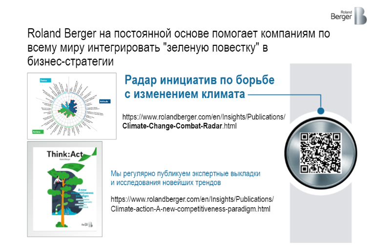 Roland Berger на постоянной основе помогает компаниям по всему миру интегрировать "зеленую повестку" в бизнес-стратегии. Устойчивое развитие и борьба с изменением климата является одним из наших стратегических приоритетов. Мы активно участвуем в движении СОР26, а также в ноябре 2021 Roland Berger стал экспертным партнером 12го Форума по устойчивым инновациям SIF в Глазго, Шотландия.