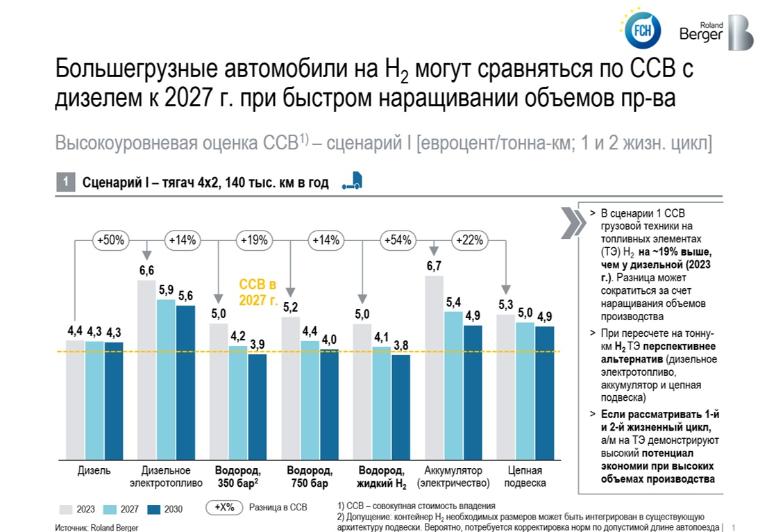 Большегрузные грузовые автомобили на топливных элементах и водороде могут сравняться по совокупной стоимости владения с дизелем уже к 2027 году при быстром наращивании производства (см слайд).