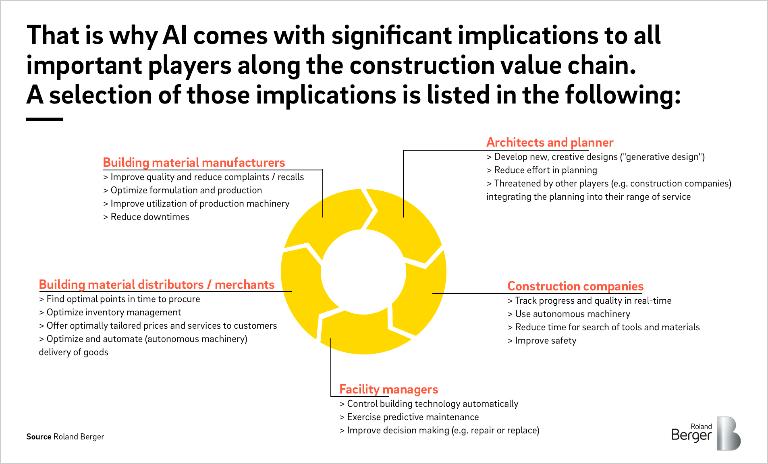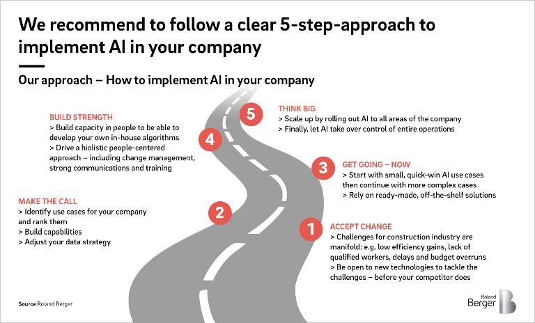 The construction industries are on the verge of digitalization, which is disrupting traditional processes and also holds many opportunities in store. Artificial intelligence is expected to increase efficiency throughout the entire value chain – from the production of building materials to the design, planning and construction phase itself, and facility management as well. But how do you best benefit from AI in your company? Roland Berger recommends a five-step approach to introduce AI into your company.