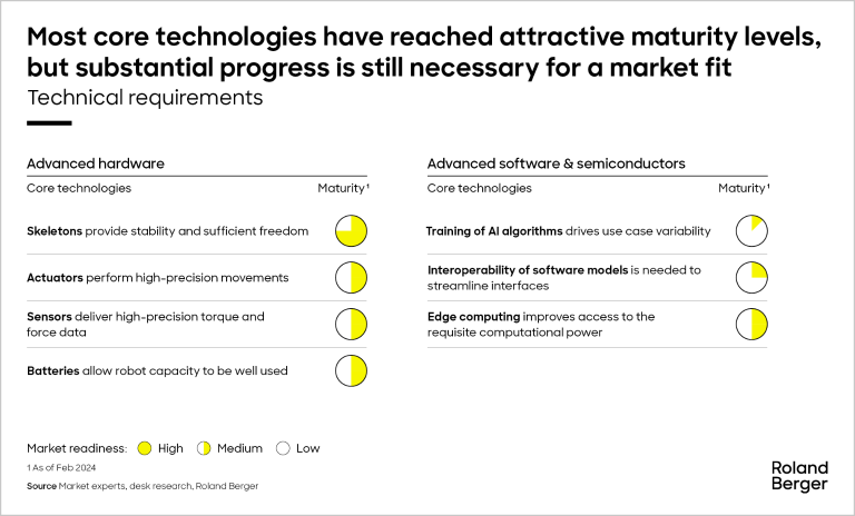 罗兰贝格的研究肯定了核心技术领域中所取得的显著进展,同时也着重指出,若要实现人形机器人的广泛普及与稳固立足,还需取得更多关键性突破。尽管当下技术突破的“炫技”表现引人注目,但在当前阶段,这些技术的实际工业应用仍然极为有限。