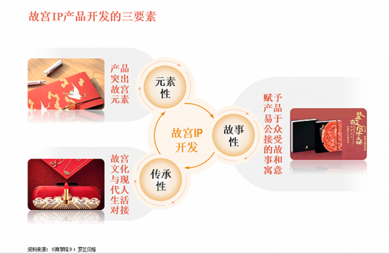 基于清晰的价值观和商业定位,故宫制定了一套围绕故宫IP开发产品的“三要素”原则,即元素性、故事性、传承性。