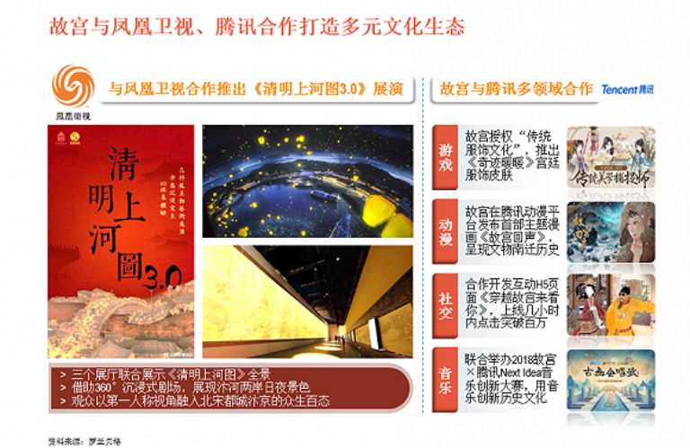 除文创业态外,故宫博物院与凤凰卫视签署战略合作框架协议,联袂打造高科技互动展《清明上河图3.0》,观众以第一人称视角体验北宋都城汴京的众生百态,成为长卷中的人物; 2018年7月,腾讯与故宫博物院宣布开展长期战略合作,以互联网技术为基础,共建泛娱乐文化生态。