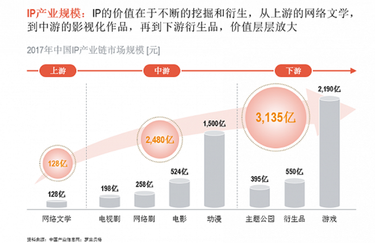 2017年,以中国原创IP为主要来源的网络文学市场,规模约为128亿元。影视、动漫等中游运营层的市场规模近2500亿元;下游的游戏、主题乐园、衍生品则是重要的变现形式,市场规模超过3000亿元