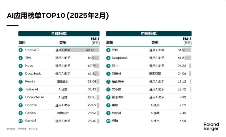 从中国AI应用TOP10榜单看,通用AI助手豆包和DeepSeek已成为超级入口。2月数据显示,豆包和DeepSeek与第三名Kimi的月活规模差距扩大至3600万。部分新晋者(如腾讯元宝)凭借接入DeepSeek模型,提供流畅体验,配合积极投流,在短时间内也实现了显著增长。文小言、智谱清言、讯飞星火等“老牌”AI助手因增速不及,面临不进则退的挑战。