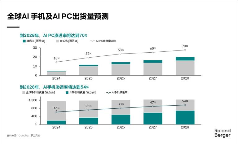 在现有硬件重塑方面,AI与硬件的融合不等同于将大模型植入已有设备,而是以系统级AI为重构人机交互范式,推动终端从被动执行向主动认知进化。典型的是AI手机和AI PC。预测至2028年,全球AIPC在出货量的渗透率将达70%,AI手机将达54%。