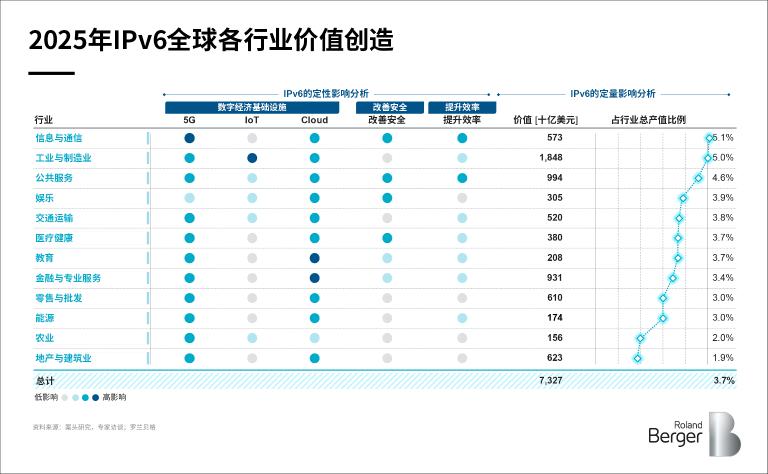 IP地址是帮助设备连接到网络的“钥匙”,设备只能在拥有IP地址的前提下才能被接入网络并实现通信。 随着智能设备数量的爆炸式增长,上一代IP地址协议IPv4的地址资源已接近枯竭,新一代的地址协议IPv6在1998年首次问世以解决通信地址不足的问题。此外, IPv6通过在数字经济中结合新兴技术,即IPv6+,提供了更高质量、更加智能的连接,进而能够促进5G、云计算和工业物联网等技术的应用。预计2025年,估计IPv6带来的行业总价值将达到7.3万亿美元。