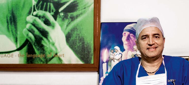 Operating theatre one in Narayana Health (NH), Bengaluru, India, is an oasis of calm. Madonna's song "Don't Tell Me" is playing through the speakers. The anesthetist softly hums along as she stands at the head of the patient – Debashish Saha (not his real name), male, 50 years old – watching his vitals. A couple of junior doctors stand over him and two nurses wordlessly hand them scalpels and sutures. A perfusionist and her assistant sit by the heart-lung machine, keeping an eye on blood circulation. Two technicians record medical and clinical stocks being used. Over a couple of hours, with easy, experienced precision, the team opens Saha's skin and sternum, exposing his pink, beating heart underneath.